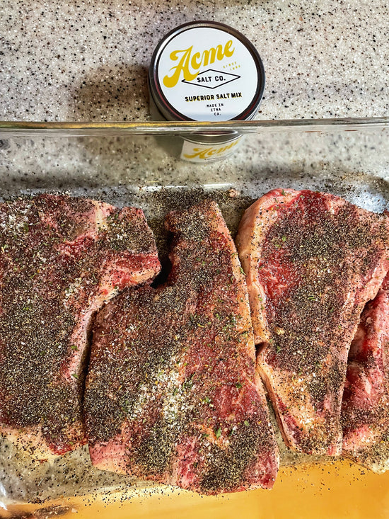 All you need is salt and pepper for delicious steaks, or season with locally made Acme Salt for a knock-the-boots-off-you flavor!