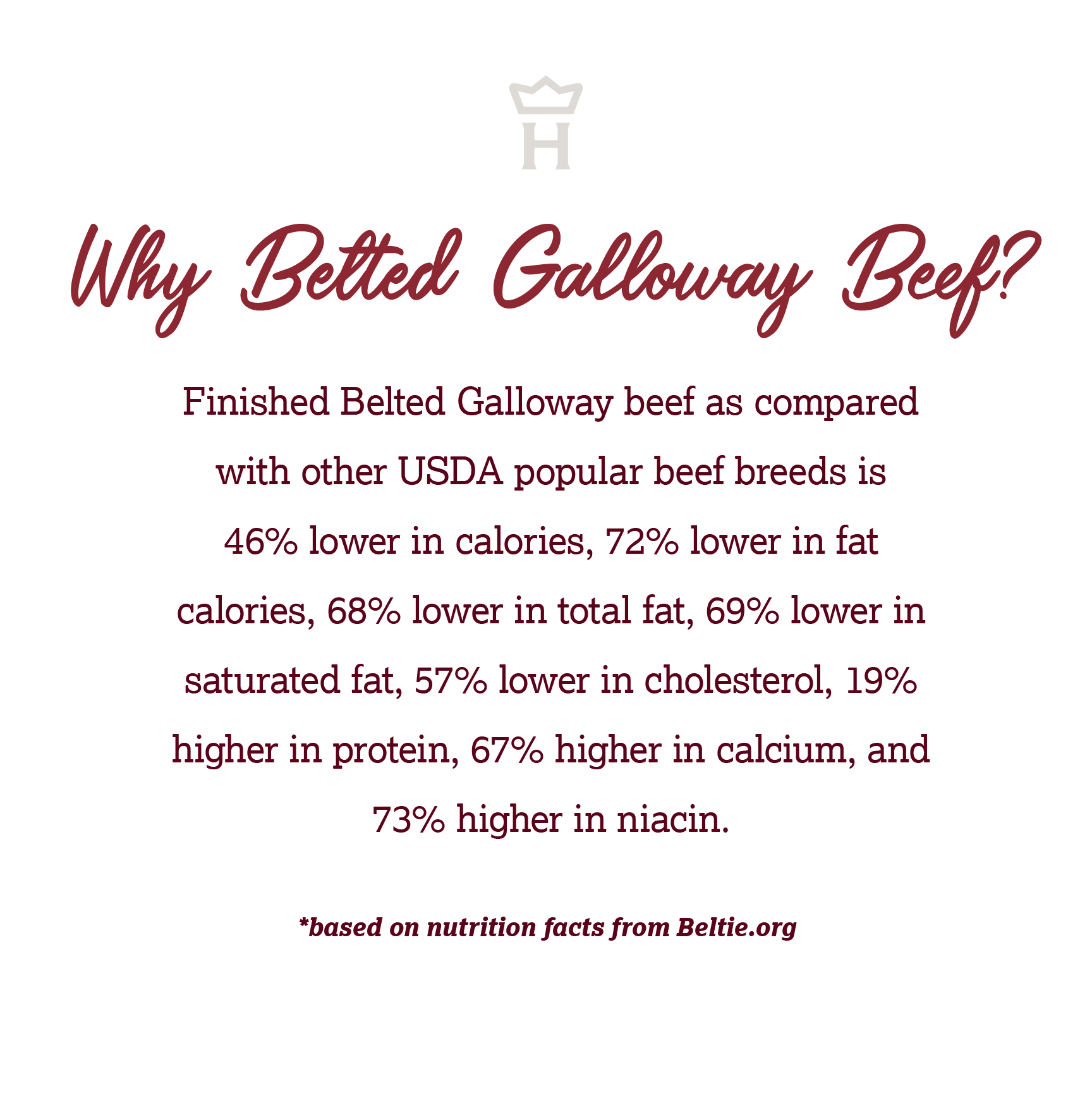 Natural, Ranch Raised, and Dry-aged Belted Galloway Beef.